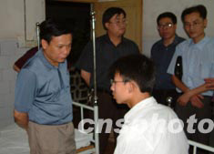 廣東省始興中學(xué)六月一日發(fā)生學(xué)生集體食物中毒意外,有五十五名中學(xué)生因食用不潔食品引起細菌性食物中毒。到六月二日下午,仍有十五人需留院觀察治療,但已確定無生命危險指征。圖為中共始興縣委書記馮壽宗在醫(yī)院病房看望中毒學(xué)生。作者:馮昶