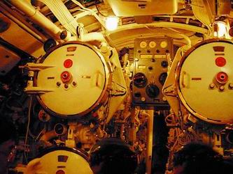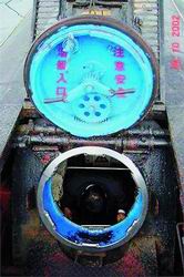 打開潛艇前部的一個(gè)艙蓋,只看到舷梯下面一片昏暗。這樣的進(jìn)出艙口,在潛艇上部共有3個(gè)。艙口的直徑也就0.6米到0.7米寬,剛剛夠一個(gè)成年人進(jìn)出。從陽光燦爛的露天走下舷梯,眼前一團(tuán)漆黑,過了一會兒,漸漸才能看見艙內(nèi)密布的儀表、管道、閥門。原來,為了節(jié)約能源和適應(yīng)水下作業(yè)的壓力,潛艇內(nèi)使用的都是光線昏黃的防爆燈,燈泡的外面還用小拇指寬的鐵條箍住。