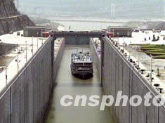 中新網三峽六月十三日電(記者全安華)今日上午十一時三十五分,重慶“江渝十五號”緩緩駛出天下第一門,世界最大船閘三峽永久船閘,首次實船實驗成功。