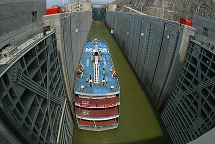 今日上午九時十分,五閘室水位已經降到與下游水位一致,閘門已經打開,全長七十八米、寬十六點四米,定噸三千噸的重慶長江輪船公司“江渝十五號”,在經過周密安全檢驗后由下游緩緩駛入五閘室,隨后閘門緩緩關閉,輸水系統(tǒng)開始充水抬高閘室水位,“江渝十五號”隨閘室水位上升而上升。