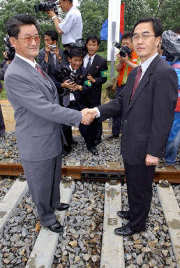 兩國鐵路連接于2000年6月15日簽訂協(xié)議,原定去年完成連接,但由于朝鮮的核計劃問題而推遲到今天。盡管鐵路已經聯(lián)起來了,但在火車通行前還要安裝電子和信號設備。