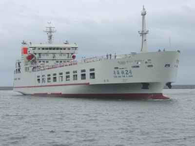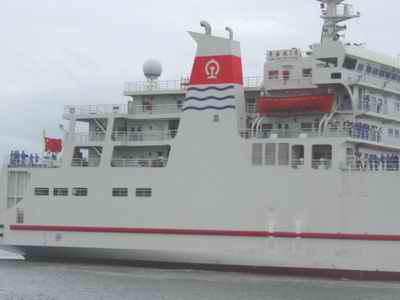 據(jù)了解,“鐵二號(hào)”從設(shè)計(jì)到造型、從長相到身材,幾乎和“鐵一號(hào)”沒有什么差異。總長度一百六十五點(diǎn)四米,寬二十二點(diǎn)六米,排水量一萬二千四百噸,載車重量四千二百噸,主甲板可以載貨運(yùn)列車車廂四十節(jié)或客運(yùn)列車十八節(jié)、旅客一千三百六十人。