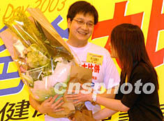 為歡度一年一度的父親節(jié),香港時(shí)代廣場(chǎng)六月十五日舉行“做個(gè)健康爸爸努力保護(hù)頭家”活動(dòng),圖為一位患“非典”家屬向醫(yī)生獻(xiàn)上鮮花致意。錢興強(qiáng) 攝
