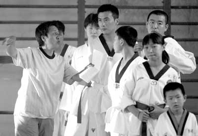 一大早,記者就趕到什剎海體校。道館外,一幫跆拳道館的學員們早已換好了行頭,等著他們的“同學”柳云龍的到來。盡管演員們還沒有來到現(xiàn)場,可是跆拳道館內攝影、燈光、錄音等幕后工作人員卻已經(jīng)把一切準備工作完成?赡苁菐滋靵淼膭陬D,大家都休息不好,場邊的椅子上一個小伙子睡著了。劇組周小姐說:“我們今晚還要忙到夜里一點!彪m然這幾天非典疫情已經(jīng)得到控制,但是劇組為了防患于未然,還是立下了一個規(guī)矩:拍攝時,現(xiàn)場不得超過50人,而此前所有的人在進學校大門時已經(jīng)測過了體溫。