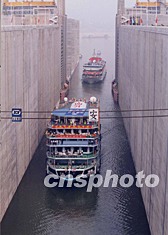 九時(shí)四十三分,由南線下行試航船隊(duì)全部進(jìn)入第二閘室,這時(shí)閘室水位同長(zhǎng)江水位相平。船閘共有五個(gè)閘室,由于是初期蓄水一百三十五米,通航只需過(guò)四級(jí)即可。