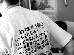 據(jù)《現(xiàn)代快報》報道,該外籍男子當時身著一件后背印有字跡的T恤,上面寫著“給中國人十條告誡”,如“(1)不許盯看外國人,(2)不要跟外國人說HELLO、OK,(3)允許外國人住便宜旅館”等內(nèi)容。在場的兩位市民許先生和陳先生對“老外”T恤上的文字表示不滿,當即上前讓其脫下該衣服,在場的其他市民也紛紛附和。