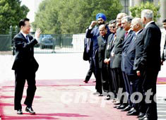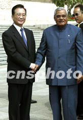 國(guó)務(wù)院總理溫家寶二十三日在北京歡迎到訪的印度總理瓦杰帕伊。中新社記者:鄭萍萍