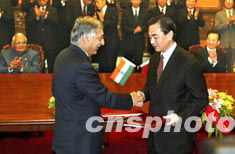 中國國務(wù)院總理溫家寶二十三日與印度總理瓦杰帕伊舉行會談后,中印雙方簽署了《中印關(guān)于簡化簽證手續(xù)的諒解備忘錄》等九個文件。中新社記者:鄭萍萍
