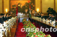 中國國家總理溫家寶二十三日與來訪的印度總理瓦杰帕伊舉行正式會談。中新社記者:鄭萍萍