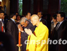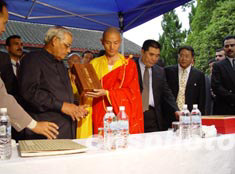 印度總理瓦杰帕伊二十五日參觀位于河南洛陽(yáng)的“中國(guó)第一古剎”白馬寺,向白馬寺贈(zèng)送銅制鍍金釋迦牟尼佛像。作者:何曉聰  印度總理瓦杰帕伊二十五日在河南洛陽(yáng)參觀“中國(guó)第一古剎”白馬寺。作者:何曉聰