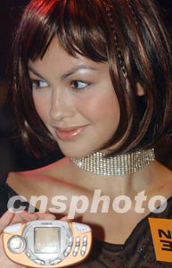 諾基亞六月二十五日晚在香港舉行產(chǎn)品發(fā)布會,推出新款流動電話3300。圖為香港名模Rosemary展示新款手機3300。 中新社記者 錢興強