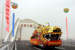 中新網(wǎng)6月28日電 世界上跨度最大的鋼拱橋——上海盧浦大橋,二十八日上午正式建成通車,小巨人姚明帶領(lǐng)千名中外長(zhǎng)跑愛(ài)好者參加了主題為“活力上海,奔向未來(lái)”跨橋長(zhǎng)跑活動(dòng)。