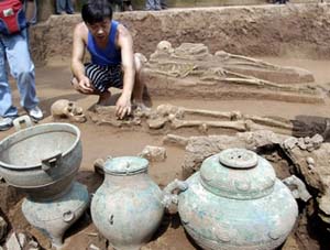 在發(fā)掘現(xiàn)場可以看到,遺址東南部寬7.3米、長9米以上的墓坑內(nèi),3具長1.6米左右的尸骨頭朝南方,整齊地?cái)[放在墓坑中央,臉部全部向東。陳祖軍告訴記者:“這些尸體的左臂卷曲在胸前,右手都是處于非正常狀態(tài),有的是小臂和大臂緊緊地貼在一起,有的肘關(guān)節(jié)已經(jīng)錯位,所以這3具尸骨很可能是殉葬或者祭祀的犧牲品。在祭祀品下面可以隱約看見板狀的東西,可能是棺材。在厚約30厘米的土層下,可能埋有墓葬的主人。從出土器物的規(guī)格和數(shù)量來看,肯定墓葬主人是巴國的一位王侯!保牐