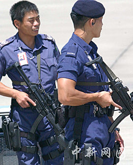 中國國務(wù)院總理溫家寶,六月二十九日中午乘專機抵達香港國際機場,在香港進行為期三天的訪問。圖為香港國際機加強警戒。中新社記者 錢興強 攝