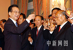 六月二十九日,國(guó)務(wù)院總理溫家寶在香港見(jiàn)證“內(nèi)地與香港更緊密經(jīng)貿(mào)關(guān)系安排”簽字儀式,圖為溫家寶在簽字儀式上向香港知名人士祝酒。中新社記者 潘索菲 攝