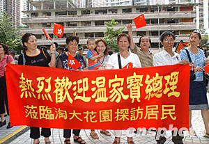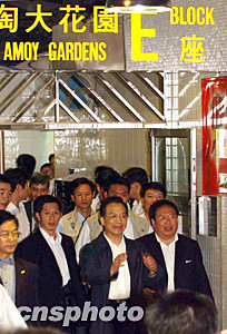 六月三十日,國務院總理溫家寶訪問香港社區(qū)淘大花園。淘大花園曾為SARS重災區(qū)。中新社記者 潘索菲 攝