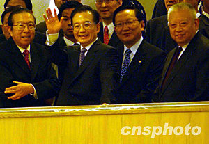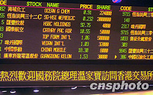 中新社香港六月三十日電 國(guó)務(wù)院總理溫家寶今天下午在香港特首董建華及財(cái)政司司長(zhǎng)梁錦松陪同下參觀香港交易所。溫家寶到場(chǎng)時(shí),在場(chǎng)交易所工作人員紛紛站立,且以熱烈掌聲歡迎總理一行。