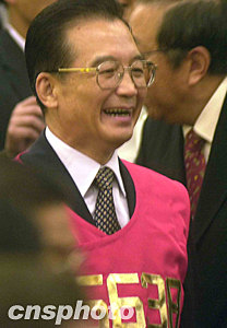 溫家寶甫走入會(huì)場(chǎng),即向在場(chǎng)人士揮手致意,且和很多工作人員握手,還與一些工作人員親切交談,有工作人員要求和溫家寶合影,他也滿足了他們的要求。溫家寶穿上一件編號(hào)“6638”的紅色出市背心,這是一組喻意好運(yùn)的數(shù)字。