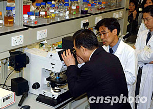 六月三十日,國務(wù)院總理溫家寶參觀香港大學(xué)基因中心,并聆聽教授介紹,如何首先找到SARS冠狀病毒。中新社記者 潘索菲 攝