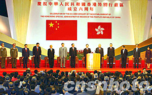 中新網(wǎng)7月1日電 香港特區(qū)政府今天上午在會(huì)展中心舉行盛大酒會(huì),隆重慶祝香港回歸祖國(guó)六周年。多個(gè)民間團(tuán)體也將舉辦一連串活動(dòng),祝賀及見(jiàn)證今日盛事。