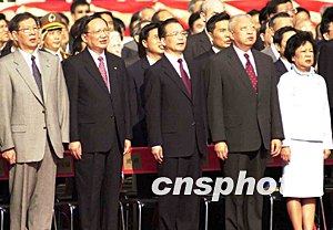 香港灣仔金紫荊廣場(chǎng)今早舉行升旗儀式。當(dāng)國(guó)務(wù)院總理溫家寶在特區(qū)行政長(zhǎng)官董建華陪同下步入廣場(chǎng)時(shí),全場(chǎng)響起熱烈的掌聲。升旗儀式有三千名嘉賓參加,由香港警察銀樂(lè)隊(duì)奏樂(lè)。