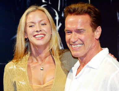 7月2日,好萊塢動(dòng)作明星施瓦辛格(右)和美國(guó)影星克里斯蒂娜·洛肯在東京出席他們主演的新片《終結(jié)者3》的新聞發(fā)布會(huì)。《終結(jié)者3》將于7月12日在日本公映。