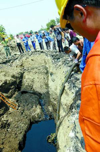 12時(shí)許,經(jīng)過緊張挖掘,維修人員在地面以下3米的“穿路套管”處,發(fā)現(xiàn)泄漏出來的原油,記者看到這里油如泉涌。據(jù)現(xiàn)場的技術(shù)人員介紹,從現(xiàn)場情況看來,泄漏情況比較嚴(yán)重,必須把這段長約24米的“穿路套管”打開后才能進(jìn)行維修。