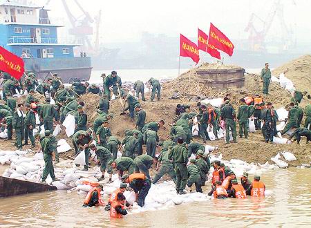 記者今天上午在現(xiàn)場看到武警上?傟(duì)第9支隊(duì)3中隊(duì)的數(shù)百名官兵身穿桔紅色救生衣,有的在碼頭上搬運(yùn)沙袋,有的站在齊腰深的積水里修筑堤壩。這些戰(zhàn)士們從昨天凌晨進(jìn)入現(xiàn)場搶險(xiǎn)后,分批投入戰(zhàn)斗,至記者發(fā)稿時(shí)已經(jīng)連續(xù)戰(zhàn)斗了30多個小時(shí)。
