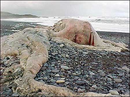 上周被海水沖上智利蒙特港附近海灘的一大塊黏滑肉質(zhì)物體可能是一種稀有的巨型章魚,或者只是死去鯨魚的一塊鯨脂。智利鯨魚保護中心表示,這具遺骸長12.4米,重約13噸,6月24日在馬烏林附近的太平洋海岸被人發(fā)現(xiàn),原先人們誤認為是鯨魚。