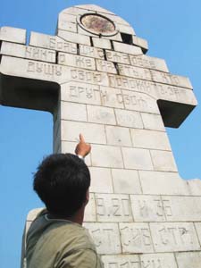 這座由沙俄建立的紀念碑呈十字架形,高6米,寬0.7米,以灰白色花崗巖砌筑,碑的上端鑲嵌著圓形彩色“圣母”頭像,下面鐫刻著俄文。日期為1904至1905年,即“日俄戰(zhàn)爭”的時間。