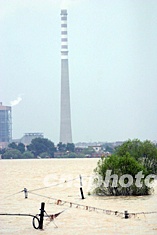七月十一日,淮河水位上漲,淮河沿岸多處地區(qū)出現(xiàn)險(xiǎn)情,如果出現(xiàn)潰堤,淮南的發(fā)電廠、煤礦等都將受到巨大損失。圖為即將沒(méi)頂?shù)碾娋桿與發(fā)電廠隔堤相望。中新社記者:盛佳鵬