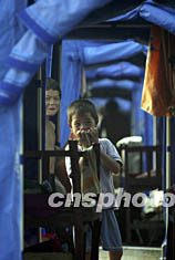 七月十三日,兩名兒童在堤壩上搭建的帳篷中無憂無慮地玩耍。安徽淮南東風湖的部分受災群眾都被安全地安置到堤壩上,當?shù)卣疄樗麄兲峁┝司葹募Z和各種生活用品,生活逐步正常。中新社記者:盛佳鵬