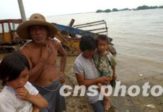 七月中旬的淮河洪水迫使安徽省穎上縣多處行洪區(qū)緊急破堤行洪,許多百姓被困在滔滔洪水中的高臺地帶,救濟(jì)成為當(dāng)務(wù)之急。圖為洪水圍困邱家湖行洪區(qū)堤上的農(nóng)民。中新社記者:賈國榮