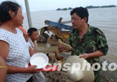 安徽省穎上縣半崗鎮(zhèn)空臺村的一千多名男女老少,因邱家湖七月十二日破堤行洪而被洪水四面圍困,災(zāi)民們吃的是用發(fā)霉的麥子做的面餅,不少人吃后都肚子痛。圖為災(zāi)民讓乘船前來看望的解放軍軍分區(qū)指揮員嘗一口這種面餅。中新社記者:賈國榮