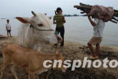 安徽省穎上縣半崗鎮(zhèn)空臺村的一千多名男女老少,因邱家湖七月十二日破堤行洪而被洪水四面圍困,百姓和牛羊家畜擠在孤土堤上,衛(wèi)生條件令人擔(dān)憂。中新社記者:賈國榮