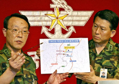 韓國參謀長聯(lián)席會(huì)議發(fā)表聲明稱,7月17日早上6:10(北京時(shí)間凌晨5:10)韓朝兩國在非軍事區(qū)用機(jī)槍交火。圖為韓國參聯(lián)會(huì)發(fā)言人李洪基上校(圖左)在參謀長聯(lián)席會(huì)議上作簡報(bào)。