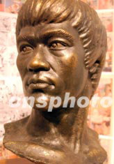 圖為展會上陳列和銷售各種造型的李小龍雕塑紀念品。