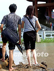 七月中旬在安徽省穎上縣八里河鄉(xiāng)的一個(gè)周末, 放假的學(xué)生們急切地返回淮河邊的家園。雖然養(yǎng)育他們的家已被洪水圍困,但是,學(xué)子們依然涉向滔滔洪水,去看望父老鄉(xiāng)親。圖為一對(duì)情侶大學(xué)生眺望家鄉(xiāng),準(zhǔn)備走下防洪堤。中新社記者:賈國(guó)榮