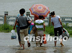 七月中旬在安徽省穎上縣八里河鄉(xiāng)的一個(gè)周末, 放假的學(xué)生們急切地返回淮河邊的家園。雖然養(yǎng)育他們的家已被洪水圍困,但是,學(xué)子們依然涉向滔滔洪水,去看望父老鄉(xiāng)親。圖為一群中學(xué)生相約走在洪水里的回家途中。中新社記者:賈國(guó)榮