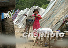 七月中旬在安徽省穎上縣八里河鄉(xiāng)的一個(gè)周末, 放假的學(xué)生們急切地返回淮河邊的家園,雖然養(yǎng)育他們的家已被洪水圍困。圖為一名小學(xué)生在淮河大堤上推車回家,她的家是眾多臨時(shí)避災(zāi)棚中的一間。中新社記者:賈國(guó)榮