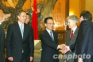 中新社北京七月二十一日電(記者張朔)中國(guó)總理溫家寶今天在人民大會(huì)堂與來(lái)訪(fǎng)的英國(guó)首相布萊爾舉行會(huì)談,雙方對(duì)“一國(guó)兩制”方針在香港的實(shí)施均給予積極評(píng)價(jià)。