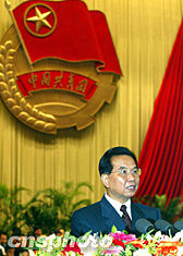 當(dāng)胡錦濤等中共中央九位常委和其他領(lǐng)導(dǎo)人進入會場后,百余名少先隊員手捧鮮花踏著軍樂的鼓點從會場四周向中央?yún)R聚,把會場氣氛再次推向了高潮。隨后,六名分別來自內(nèi)蒙古、北京、云南和河北的不同民族的少先隊員步上主席臺,開始充滿感情的朗誦。他們用詩歌演繹著自己未來的夢想,講述著自己親身經(jīng)歷的故事,表達了對團組織的深切向往。少先隊員們真摯的言語打動了在場的每一個人,人們不時報以熱烈的掌聲。