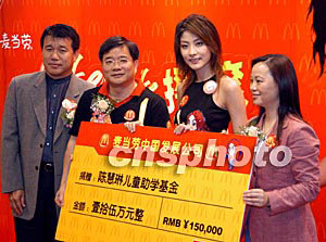 麥當(dāng)勞“搖滾薯?xiàng)l”形象代言人陳慧琳七月二十二日下午現(xiàn)身廣州,在海珠廣場麥當(dāng)勞分店參加了一系列的推廣活動(dòng)。當(dāng)天廣東三元麥當(dāng)勞公司向陳慧琳兒童基金捐款十五萬元人民幣。作者:梁永強(qiáng)