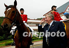 出席亞歐經(jīng)濟(jì)高層論壇的美中貿(mào)易發(fā)展協(xié)會(huì)主席羅潔民先生,二十二日游覽大連時(shí)向美麗的女騎警致意。中新社記者:鄭萍萍