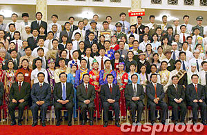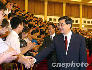 中共中央總書(shū)記胡錦濤等黨和國(guó)家領(lǐng)導(dǎo)人,二十二日在北京出席中國(guó)共青團(tuán)第十五次全國(guó)代表大會(huì)開(kāi)幕式,并在會(huì)前接見(jiàn)大會(huì)代表。中新社記者:滿會(huì)喬