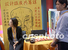 香港家庭用品、禮品及贈(zèng)品綜合展,七月二十三日在香港會(huì)展中心開幕,圖為展會(huì)上一廣告商以看相指點(diǎn)迷津吸引參觀者。中新社記者:錢興強(qiáng)