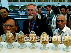 出席第五屆亞歐經(jīng)濟(jì)部長會(huì)議的官員們利用會(huì)議間歇,來到大連商品交易所,查看大豆等交易商品的樣品。中新社記者:鄭萍萍