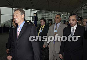 因受伊布都臺風(fēng)影響,英國首相布萊爾七月二十三日提前結(jié)束在香港的訪問,乘專機離港。中新社圖