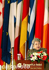 中國國務(wù)院副總理吳儀七月二十四日在大連出席第五屆亞歐經(jīng)濟部長會議開幕式。中新社記者:鄭萍萍