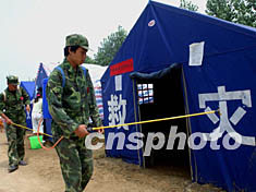 安徽省淮河洪水災(zāi)區(qū)的阜南縣王家壩又遇七月下旬的高溫,當(dāng)?shù)匚溲b部派出民兵緊急噴灑消毒劑防疫。中新社記者:賈國(guó)榮